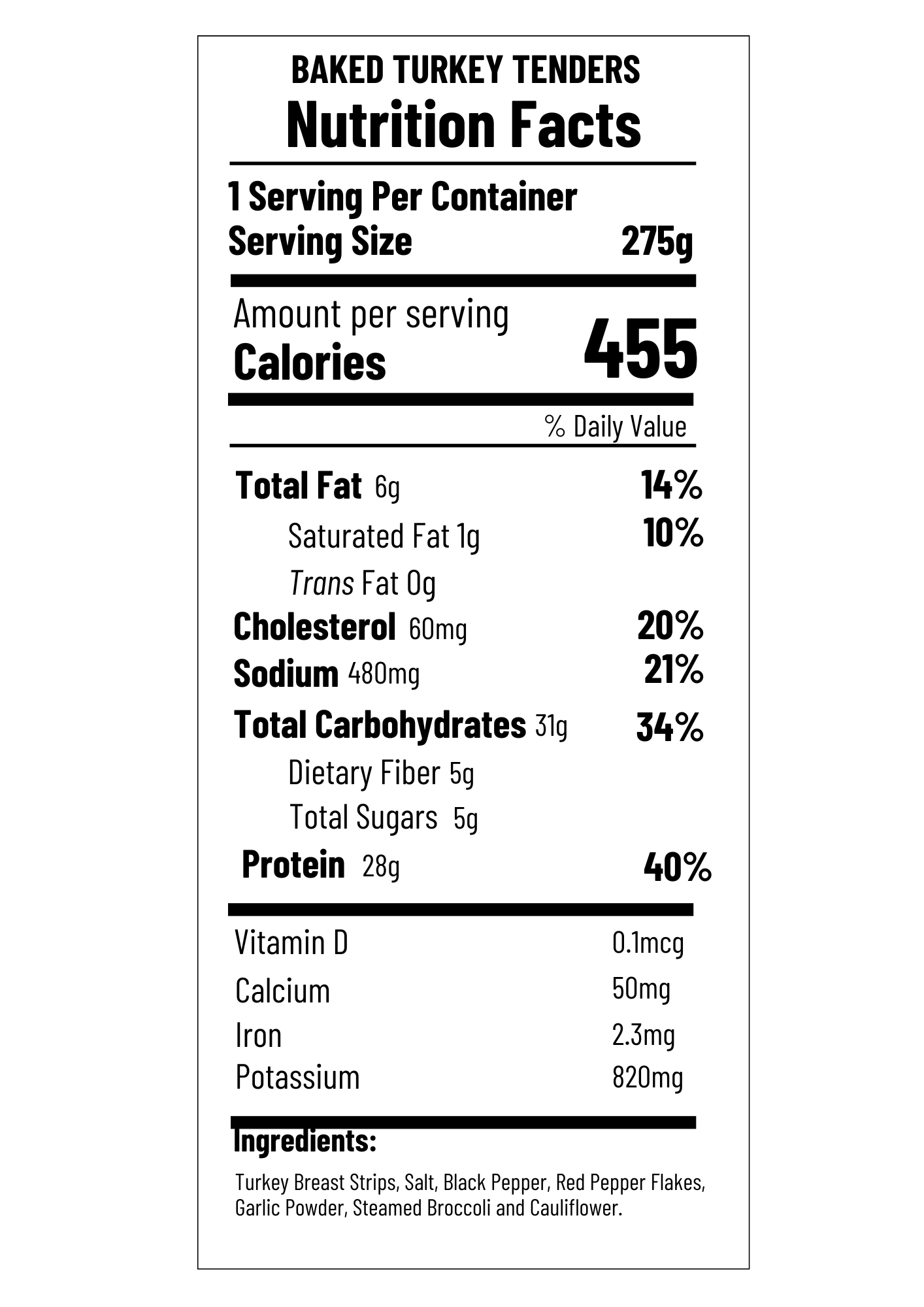 Lightly seasoned strips of all white, all-natural turkey baked and served with steamed broccoli and cauliflower.