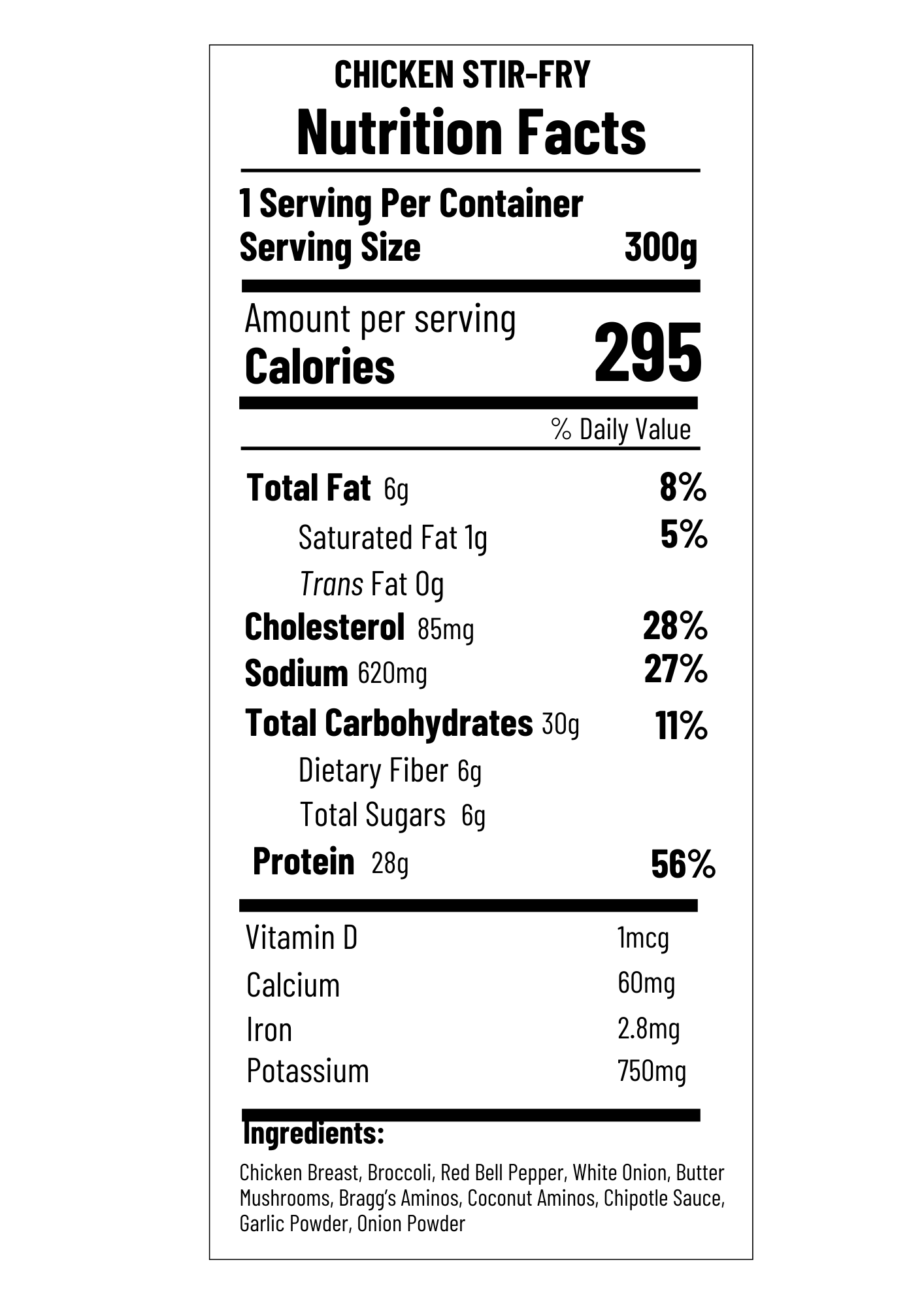 Chef-prepared chicken breast strips marinated in Bragg's aminos with chipotle heat, paired with fresh broccoli, red peppers, onions, and mushrooms. This protein-rich stir-fry delivers bold, savory flavors while keeping you on track with clean ingredients and balanced macros. Ready to heat and enjoy—premium nutrition without the prep work.