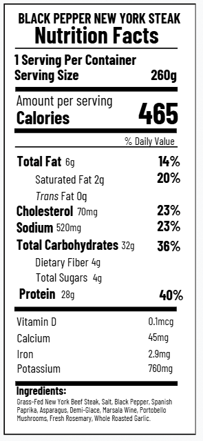 Indulge in our New York steak, made from grass-fed beef and served with asparagus. Prepared with no oils, but seasoned to perfection with our signature blend. Enjoy a delicious and healthy meal, with the added benefit of knowing you're fueling your body with quality ingredients.