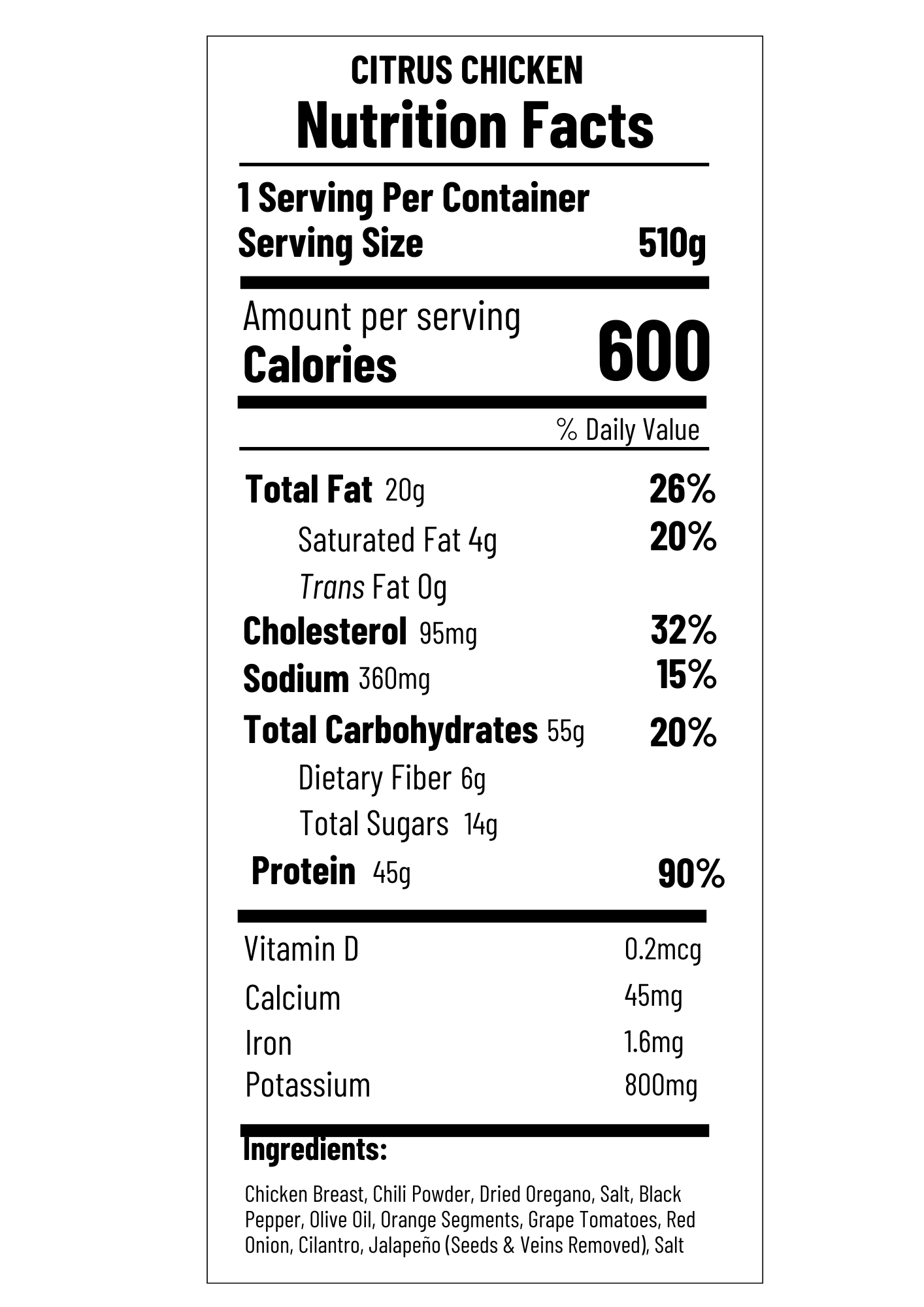 Indulge in our Citrus Chicken, featuring juicy grilled chicken breast seasoned with a savory oregano rub and topped with a zesty salsa made with fresh California oranges, organic grape tomatoes, red onion, and organic cilantro.