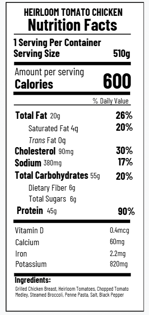 Indulge in our Heirloom Tomato Chicken - tender and juicy grilled chicken breast served with a fresh and flavorful chopped tomato medley, paired perfectly with steamed broccoli and penne pasta. A delicious and nutritious meal option.