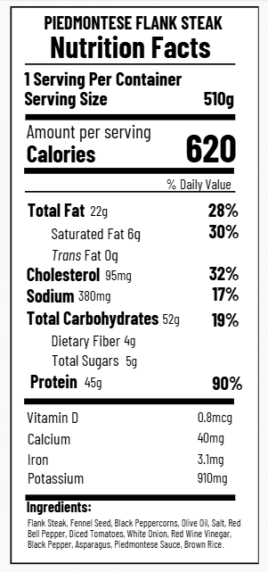 Enjoy the ultimate dining experience with our Piedmontese Flank Steak. Expertly seasoned and grilled to perfection, this cut of beef is tender and flavorful. Savor each bite and pair it with our robust Piedmontese tomato and bell pepper sauce for a truly elevated meal.