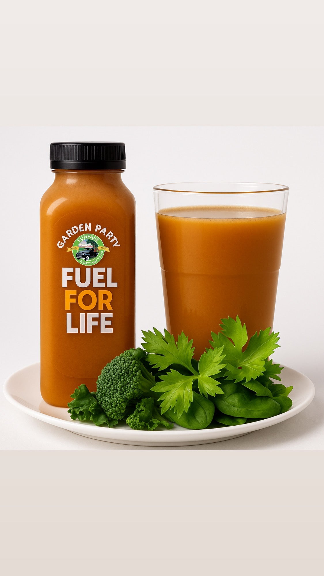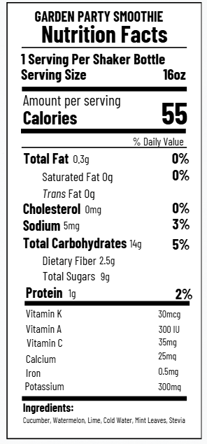 Garden Party is a crisp, hydrating green juice crafted to refresh your body while supporting digestion, hydration, and overall wellness. With only 55 calories, this juice delivers essential vitamins and minerals without weighing you down—making it perfect for Fat Burn days, warm afternoons, or anytime you want something light and revitalizing.